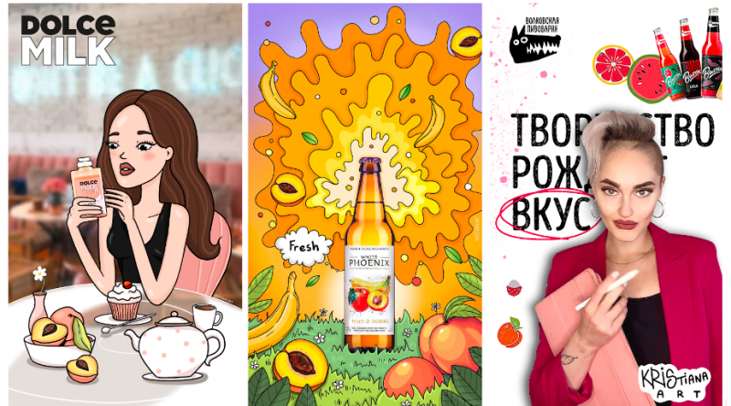 Кристина начала свой путь с зарисовок портретов на бумаге. Сейчас она много экспериментирует, создает яркие иллюстрации и делает креативные анимационные ролики для рекламы продуктов.