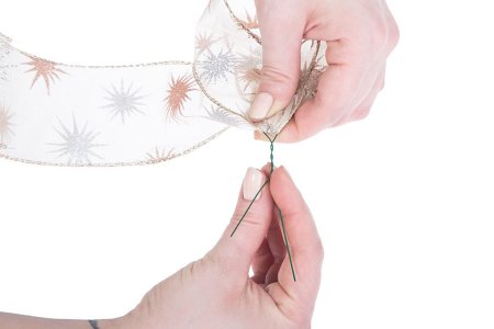 - Перехватываем декоративную ленту проволокой и формируем бант, с помощью клея или проволоки прикрепляем к банту звезду или любое другое яркое новогоднее украшение.