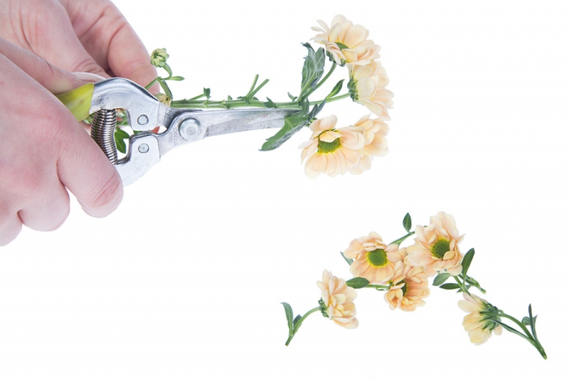- Готовим цветы. Нам нужны совсем небольшие сегменты, но при этом такие, чтобы ножки доставали до воды, поэтому оптимально оставить около 3 см стебля от бутона. Подрезаем цветы обязательно под острым углом.