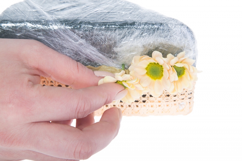 - Для начала готовим оазис — замачиваем его в емкости с холодной отстоявшейся водой, не нажимая при этом на губку, — пусть погружается в воду сама, под своей тяжестью. Иначе в полости оазиса образуются пустоты, растения не смогут получать достаточно влаги, а значит, быстро увянут. Из губки острым ножом вырезаем нужную форму. Получившуюся заготовку плотно обматываем пленкой, чтобы не просачивалась вода, а влага не испарялась.