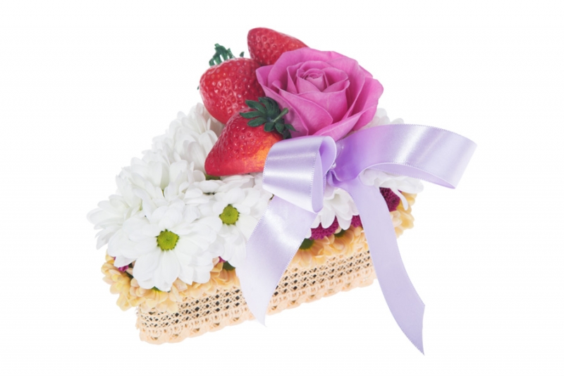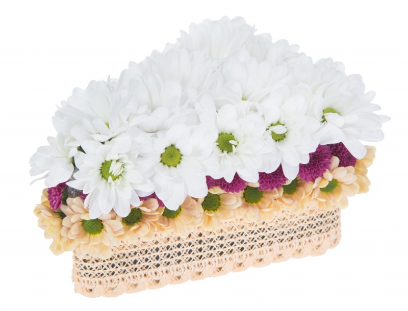 Букеты из конфет — классика подарков на 8 марта. А если наоборот — торт из цветов? Ноль калорий — а как красиво! Сделать такой необычный торт на 8 марта своими руками несложно — с этим вполне справятся дети-школьники под руководством папы, чтобы поздравить маму с 8 марта. Пошаговый мастер-класс расскажет, как правильно обращаться с цветами и губкой-оазисом и как ухаживать за букетом-тортом, чтобы подарок на 8 марта радовал получательницу не день или два, а 2-3 недели. Нам понадобятся: цветы для наполнения фигуры (оптимально брать для таких целей кустовую хризантему разных фактур, цветов и размеров) роза флористическая губка — оазис упаковочная стретч-пленка двусторонняя липкая лента жатая упаковочная бумага ажурная лента и искусственные ягоды для декора инструменты С помощью этого мастер-класса вы сможете сделать и другие подарки своими руками. В зависимости от формы это могут быть пирожные, сердца, смайлики — все, что подскажет ваша фантазия. Для начала готовим оазис — замачиваем его в емкости с холодной отстоявшейся водой, не нажимая при этом на губку, — пусть погружается в воду сама, под своей тяжестью. Иначе в полости оазиса образуются пустоты, растения не смогут получать достаточно влаги, а значит, быстро увянут. Из губки острым ножом вырезаем нужную форму. Получившуюся заготовку плотно обматываем пленкой, чтобы не просачивалась вода, а влага не испарялась. Будущий низ изделия маскируем упаковочной бумагой, декорируем лентой — в этом нам поможет двусторонний скотч. Готовим цветы. Нам нужны совсем небольшие сегменты, но при этом такие, чтобы ножки доставали до воды, поэтому оптимально оставить около 3 см стебля от бутона. Подрезаем цветы обязательно под острым углом. Начинаем ставить цветы в основу — сначала протыкаем пленку шпажкой или зубочисткой, потом в образовавшуюся нишу аккуратно ставим цветок. Так заполняем все пространство тортика. Декор крепим на шпажки. Последний штрих — бант из атласной ленты. Подарок к 8 марта готов. Можно не обматывать оазис пленкой, но тогда изделие нужно будет ежедневно поливать из обычной лейки или шприца, чтобы вода попадала в губку, но не на бутоны. Тогда губка будет регулярно напитываться влагой и питать растения. Авторская статья