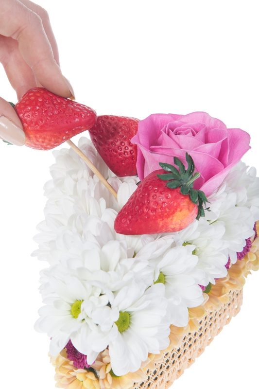 - Начинаем ставить цветы в основу — сначала протыкаем пленку шпажкой или зубочисткой, потом в образовавшуюся нишу аккуратно ставим цветок.