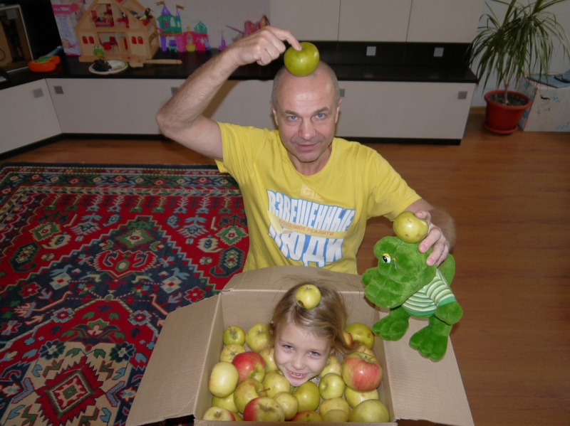 Посмотрим на третье фото, где мой муж и дочка в яблоках. Я фотографировала. Автор идеи и режиссёр-постановщик — мой муж. Идея праздника была такова: "Чебурашку нашли в апельсинах, а мы нашли нашу дочь Вику в яблоках".