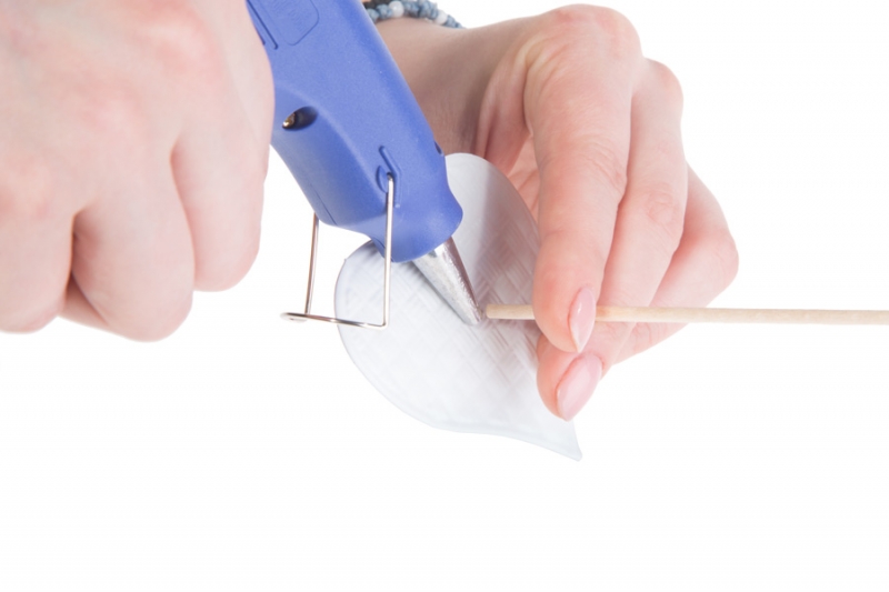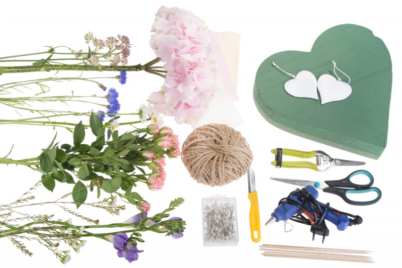 - Кроме цветов в нашей композиции будут присутствовать декоративные сердечки. Их также с использованием горячего клея насаживаем на шпажки, затем аккуратно вставляем между цветами в оазис.