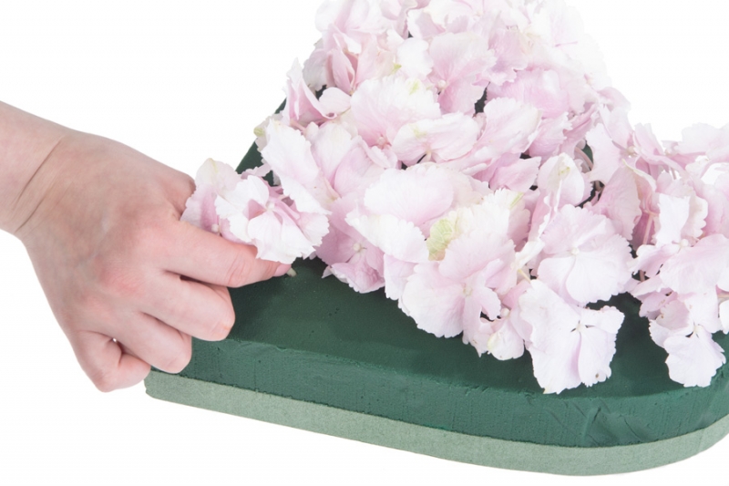 - Перед началом работы оазис в форме сердца заранее опускаем в емкость с водой, самостоятельно руками не топим, ждем, пока жидкость равномерно впитается. Примерно через 20 минут, когда губка пропиталась водой, она готова для дальнейшей работы.