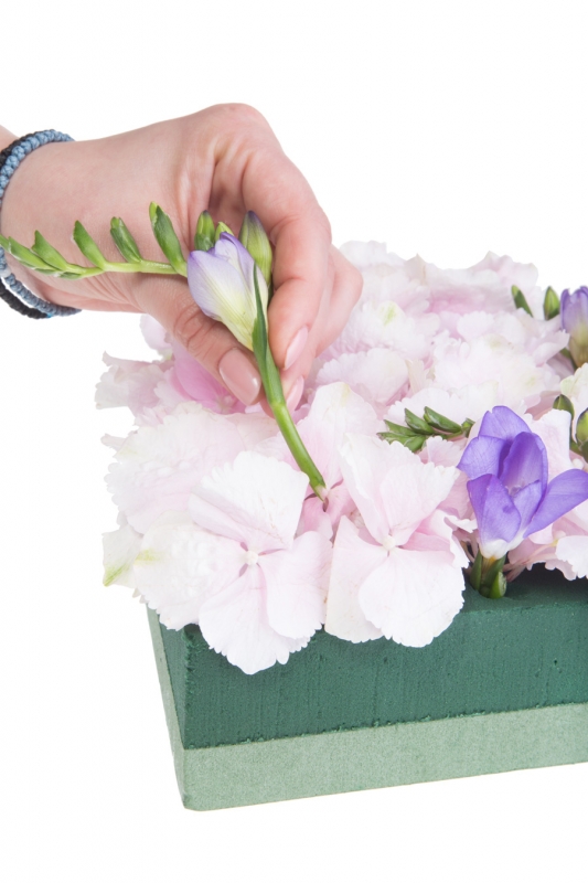 - Далее создавая контраст, сажаем во флористическую губку фрезию.