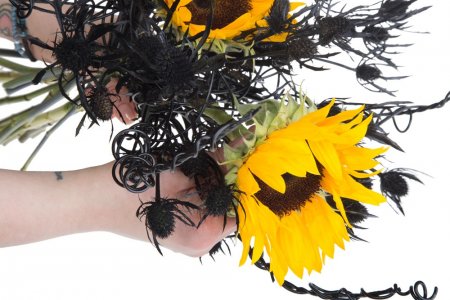 Если вы празднуете Хэллоуин, то помимо макияжа и костюмов понадобится и соответствующая обстановка — какие-то украшения для дома, которые помогут создать атмосферу жутковатого праздника. Букет своими руками будет как нельзя кстати, а устрашающего вида ему добавит каркас из черной проволоки. Как сделать букет на Хэллоуин, рассказывают и показывают специалисты компании Флорист.ру. Нам понадобятся: подсолнух, астранция белая, эрингиум черная краска проволока герберная, проволока декоративная тейп-лента, атласная лента, флористическая шпажка инструменты Делаем основание для букета — каркас из проволоки, который будет не только удерживать элементы букета, но и придаст ему