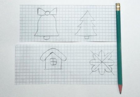 - Сначала сделаем из бумаги трафареты наших новогодних украшений. Бумагу лучше брать в клеточку — на ней проще рисовать.