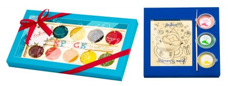 Можно выбрать разные сюжеты и размеры раскрасок в зависимости от пола и возраста ребенка. А в дополнение к ним есть мармеладный "пластилин", "карандаши", "краски". И, конечно, множество других детских презентов: шоколадные медали, фигурки — игрушки и елочные украшения, оригинально оформленные наборы конфет и шоколадные открытки.