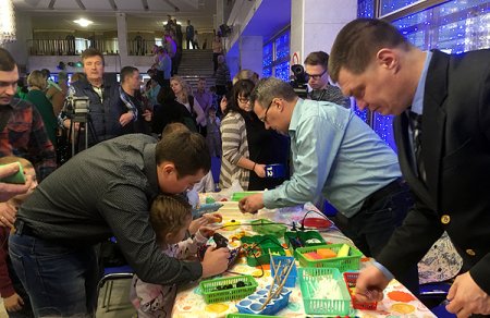 В ожидании начала официальной части и концерта кто-то из пап увлеченно мастерит вместе с детьми…