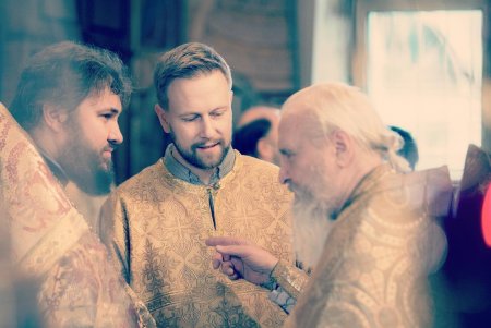 Николай Бреев во время богослужения со своим отцом протоиереем Георгием Бреевым и протоиереем Серафимом Недосекиным в храме Рождества Богородицы в Крылатском