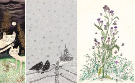 В снегопад буквально в одночасье всё вокруг становилось сказочным, и на душе был Новый год. Помнится, я показал Серёже в сильную лупу прямо на улице снежинки. Нашёл их изображения-фотографии в книгах. И сказал, что среди миллионов снежинок одинаковых никогда не будет. Серёжа это понял и стал уже по-другому смотреть на это белое чудо. И рисовать. Вот отсюда и сюжеты его картинок появлялись. Могут спросить, мол, почему он так много кошек рисует и… сорок? Да потому что у нас их много и он, вместе с нами, их любит.