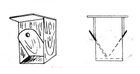 Кормушки можно сделать разных размеров и конструкций. Удобнее такие, в которых корм засыпается сразу на неделю-две, он укрывает от дождя и снега и постепенно высыпается на кормовой столик. Широкое распространение приобрела кормушка, предложенная автором этих строк. Такую кормушку лучше сделать двухсторонней. Бывает, что на полочке устроится снегирь – птица крупная и сильная: сидит, шелушит неспеша подсолнухи и никого больше не пускает. Для такого случая и хороша двусторонняя кормушка.