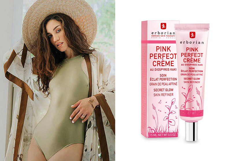 Всегда ношу с собой праймер Pink Perfection Cream от Erborian: я могу просто нанести эту базу, без тона, и в конце дня посмотреть в зеркало и понять, что классно выгляжу, потому что от нее есть легкий эффект фотошопа. На съемках она помогает сохранить макияж, даже если работаем 12 часов: к концу дня кожа все равно светится.