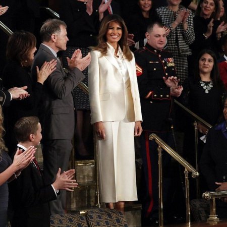 Отдельного обсуждения удостоился наряд Мелании. Для выхода в свет первая леди надела белый брючный костюм от Dior, шёлковую блузку Dolce&Gabbana, а завершили образ классические лодочки Christian Louboutin.