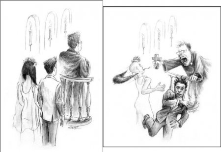 Харламов продемонстрировал рисунок, на котором некая пара, которую зрители видят со спины, ожидает благословения священника. Но тот, когда поворачивается (это изображено на второй части рисунка), вдруг оказывается обладателем лица Гарика и выкидывает перед невестой руку с крестом. В результате девушка теряет парик, изо рта у нее вырывается змеиное жало, а жених, в лице которого нетрудно заметить черты Батрутдинова, в шоке убегает.