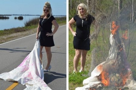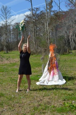 «Мы спустились с подругой по дороге к реке и устроили фотосессию с сожжением платья», - со смехом рассказала Кристи журналистам.Сначала девушка надела свой свадебный наряд, а потом испачкала его розовой краской и грязью. После Скотт накинула платье на старое дерево, облила бензином и подожгла. Свой свадебный букет из белых цветов она также бросила в костер.