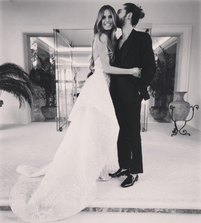 Пара охотно позировала фотографам, держалась за руки и обнималась, не скрывая чувств. На мероприятие Хайди надела полупрозрачное платье белого цвета с длинным шлейфом. Ее мужчина выбрал полностью черный костюм, сыграв на контрасте с избранницей.