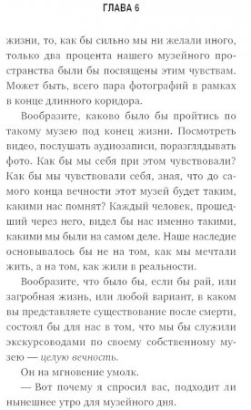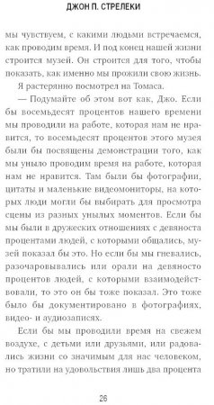 В этой книге талантливый бизнесмен Томас Дерейл делится секретом, как стать хозяином своей жизни и найти вдохновение для реализации самых смелых желаний и стремлений. Написанный знаменитым писателем и коучем Джоном Стрелеки, роман рассказывает о последних днях одного из самых успешных людей в мире и учит управлять своей судьбой, воодушевлять окружающих и помогает найти дело всей своей жизни.Неважно, кем вы работаете и к чему стремитесь — вы хозяин собственной жизни и должны научиться ею управлять. История Томаса Дерейла, крупного руководителя и бизнесмена, который стоит на пороге смерти, заставит вас задуматься о цели своего существования и вдохновит на перемены. Прочитав новую книгу Джона Стрелеки, вы сможете воплотить все свои самые смелые мечты и узнаете, как взять жизнь в свои руки, стать настоящим лидером и найти силы на ежедневные подвиги.Джон Стрелеки — писатель, путешественник и коуч, известный по всему миру. Его бестселлеры «Кафе на краю земли» и «Возвращение в кафе “Почему”» вышли на 21 языке в более чем 40 странах, воодушевив миллионы человек по всему свету. Наряду с Опрой Уинфри, Тони Роббинсом и Стивеном Кови входит в список ста самых вдохновляющих творческих лидеров в области развития личности. Из этой книги вы узнаете: • Как сохранять бодрость духа перед лицом трудностей• В чем секрет работы мечты• Почему планирование всегда лучше начинать с конца• Как заставить работу и жизнь звучать в унисон• Что общего между музеем и нашей жизньюКнигу можно приобрести по ссылке. Отрывки из книги: