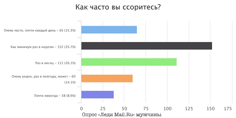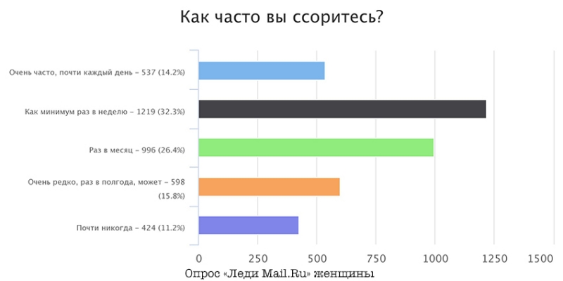 Судя по опросу, проведенному на нашем сайте (в нем приняли участие 4198 человек), пары ссорятся довольно часто. Причем мнение мужчин и женщин практически совпадает: около 37% опрошенных сообщили, что выясняют отношения как минимум раз в неделю