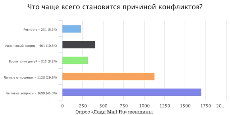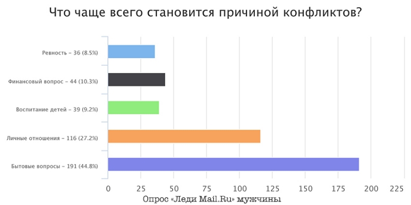 Что же становится причиной ссор? Как ни удивительно, но бытовые вопросы. Причем вопросы уборки, готовки и порядка в доме одинаково раздражают и мужчин, и женщин: примерно 45% респондентов назвали домашние хлопоты основным триггером.