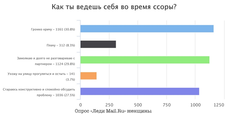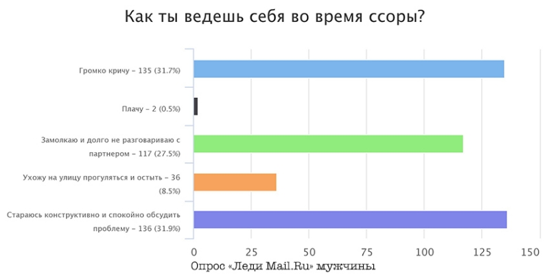 Нетемпераментные, казалось бы, россияне, дают выход своей страстной натуре именно во время ссор. Треть опрошенных (и мужчин, и женщин) во время скандалов громко кричат. Еще треть — стараются спокойно обсудить проблему.