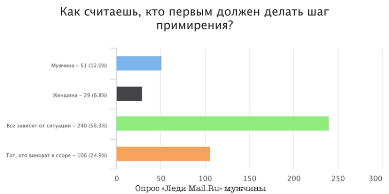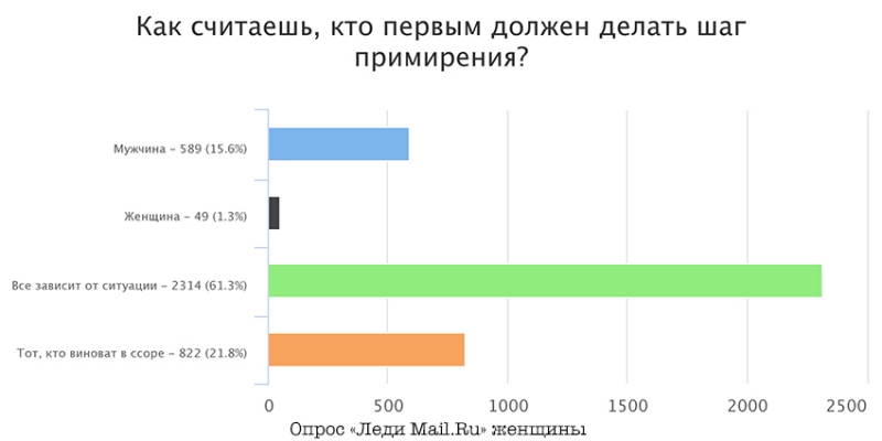 Единого мнения о том, кто именно должен делать первый шаг к примирению, у наших читателей нет. Больше половины считают, что все зависит от ситуации. Следующий по популярности ответ — «тот, кто виноват в ссоре».