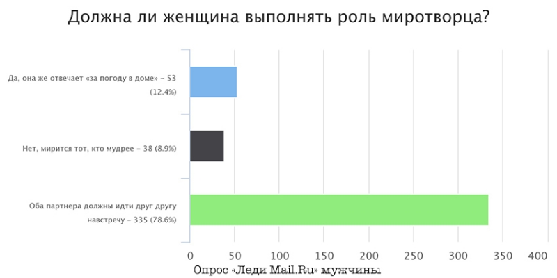 Мы узнали, как часто и из-за чего ссорятся российские пары.Конфликты — неизбежные спутники длительных отношений. Возникшее противоречие — это повод пересмотреть нюансы взаимоотношений и вывести их на качественно новый уровень. Если пара часто ссорится, это повод задуматься о том, что именно держит этих людей вместе. Если в отношениях всегда полный штиль — встает вопрос, есть ли искренность и близость. Судя по опросу, проведенному на нашем сайте (в нем приняли участие 4198 человек), пары ссорятся довольно часто. Причем мнение мужчин и женщин практически совпадает: около 37% опрошенных сообщили, что выясняют отношения как минимум раз в неделю Листайте слайдер вправо-влево, чтобы сравнить мнения. Что же становится причиной ссор? Как ни удивительно, но бытовые вопросы. Причем вопросы уборки, готовки и порядка в доме одинаково раздражают и мужчин, и женщин: примерно 45% респондентов назвали домашние хлопоты основным триггером. Нетемпераментные, казалось бы, россияне, дают выход своей страстной натуре именно во время ссор. Треть опрошенных (и мужчин, и женщин) во время скандалов громко кричат. Еще треть — стараются спокойно обсудить проблему. Есть и еще одна популярная стратегия — объявить партнеру бойкот. Что касается женщин, то они чаще дают волю чувствам: в отличие от мужчин они склонны расплакаться в порыве эмоций. Единого мнения о том, кто именно должен делать первый шаг к примирению, у наших читателей нет. Больше половины считают, что все зависит от ситуации. Следующий по популярности ответ — «тот, кто виноват в ссоре». Учитывая, что искать виноватых и правых — занятие вполне бессмысленное, мы все же надеемся, что мир в семьях воцаряется довольно быстро. Вообще, есть такой распространенный стереотип, будто за «погоду в доме» отвечает женщина. Как хранительница домашнего очага. Благодаря следующему слайду можно увидеть, что это мнение больше разделяют мужчины. Тем не менее, в целом, читатели полагают, что обоим партнерам стоит идти навстречу друг другу. Хотя, учитывая частоту конфликтов, у них это получается не очень хорошо.
