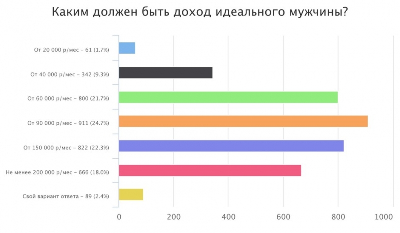 Что касается дохода мужчины, то большинство респонденток проголосовали за то, что идеальный партнер должен зарабатывать не меньше 90 000 рублей в месяц.