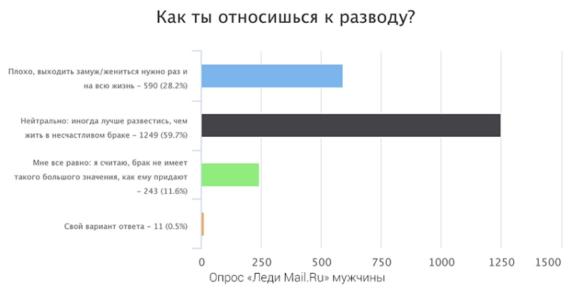 Отличается ли все же отношение к разведенным мужчинам и женщинам? Мнения разделились. Мужчины в основном ответили, что семейный статус не имеет значения. А женщины относятся к разведенным — как к сильным личностям, способным менять свою жизнь.