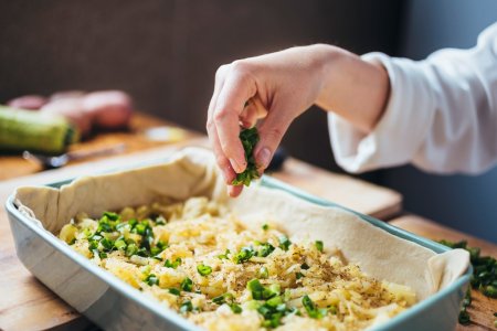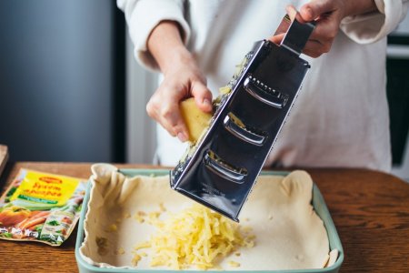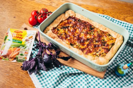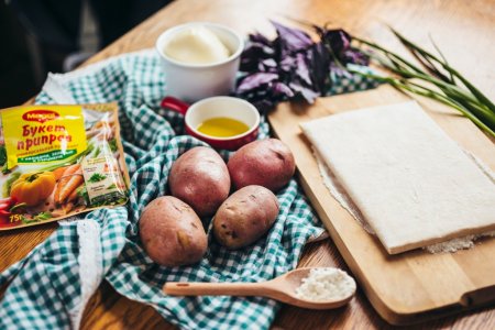 Ингредиенты тесто слоеное бездрожжевое 250 грамм картофель 4 штуки сыр 100 грамм мука 1 ч. ложка MAGGI® Букет приправ Процесс приготовления 1 Простой в приготовлении, но очень вкусный пирог. Подготовить ингредиенты. Тесто разморозить. 2 Картофель сварить в мундире. 3 Отварной картофель почистить. 4 Пласт теста раскатать, выложить в смазанную маслом форму, сделав небольшие бортики. Присыпать тесто мукой. 5 Посыпать натертым на терке отварным картофелем. 6 Посыпать приправой. 7 И измельченной зеленью. 8 Посыпать тертым сыром (выбирайте не сильно соленый) и отправить в разогретую до 180 градусов духовку на 20- 25 минут. 9 Готовому пирогу дать немного остыть, извлечь из формы и нарезать кусочками. Узнайте больше рецептов ланчей для школьников