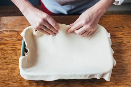 Пласт теста раскатать, выложить в смазанную маслом форму, сделав небольшие бортики. Присыпать тесто мукой.