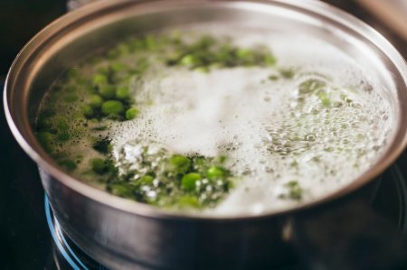 Горошек отварить в кипящей подсоленной воде в течение 3 — 4 минут. Откинуть на дуршлаг и обдать холодной водой.