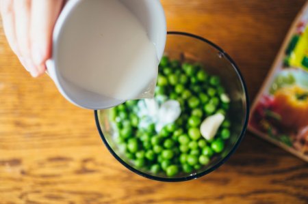 Измельчить в блендере 3/4 горошка вместе с молоком и чесноком.