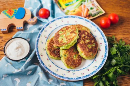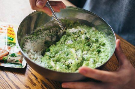Ингредиенты Мука 1 стакан Яйца куриные 1 штука Разрыхлитель 1/2 ч. ложки Чеснок (1 зубчик) Молоко 2/3 стакана MAGGI® Букет приправ Свежий зеленый горошек 300 грамм Процесс приготовления 1 Эти сытные и полезные оладушки очень вкусны с нежирной сметаной или натуральным йогуртом. Подготовить ингредиенты. 2 Горошек отварить в кипящей подсоленной воде в течение 3 — 4 минут. Откинуть на дуршлаг и обдать холодной водой. 3 Измельчить в блендере 3/4 горошка вместе с молоком и чесноком. 4 Муку смешать с разрыхлителем и приправой 5 Добавить яйцо. 6 Добавить измельченный и целый горошек, перемешать. 7 Ложкой выкладывать массу на разогретую с растительным маслом сковороду и обжаривать с обеих сторон до золотистой корочки. 8 Приятного аппетита! Детское меню: рецепты полезных и вкусных блюд