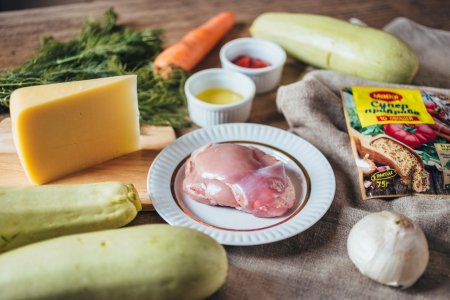 Ингредиенты кабачок 3 штуки томатный соус 2 ст. ложки куриное филе 1 штука репчатый лук 1 штука подсолнечное масло 3 ст. ложки морковь 1 штука твердый сыр 100 грамм пучок укропа MAGGI® Супер приправа 10 овощей Процесс приготовления 1 Многие дети отказываются есть кабачки в «чистом виде», например, тушенные с луком и морковью. А вот против кабачковых оладушков или – как в нашем случае – фаршированных «лодочек» ничего не имеют. Подготовить ингредиенты. 2 Кабачки можно не чистить, если они молоденькие. Отрезать плодоножку и разрезать кабачок пополам. Вычистить мякоть, оставляя стеночки около 4-5 мм. 3 Опустить кабачки на 4-5 минут в кипящую подсоленную воду, затем остудить. Кабачковую мякоть нарезать кубиком. 4 Морковь натереть на терке, лук нарезать кубиком. 5 Куриное филе нарезать кубиком, обжарить на сковороде с маслом. 6 Добавить к филе овощи (кабачковую мякоть, морковь и лук), обжарить. 7 Добавить томатный соус. 8 Добавить MAGGI® Супер приправe 10 овощей 9 Немного остудить и заполнить начинкой лодочки, отправить в разогретую духовку минут на 15-20. 10 Достать, посыпать тертым сыром и запекать еще минут 5. 11 При подаче посыпать укропом. Приятного аппетита! Приготовьте самые вкусные блюда с курочкой для вашего ребенка
