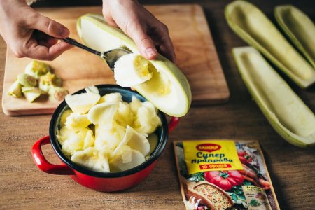 Кабачки можно не чистить, если они молоденькие. Отрезать плодоножку и разрезать кабачок пополам. Вычистить мякоть, оставляя стеночки около 4-5 мм.