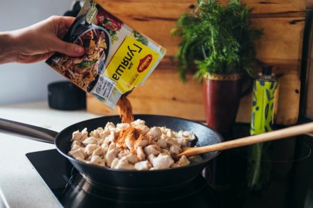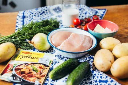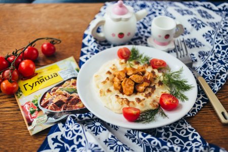 Ингредиенты куриная грудка или филе 500 грамм лук репчатый 1 штука картофель 400-500 грамм молоко 100-200 грамм сливочное масло 50-70 грамм пучок укропа овощи для подачи MAGGI® На второе для гуляша Процесс приготовления 1 Подготовить ингредиенты. 2 Филе и лук нарезать небольшими кубиками и обжарить в предварительно разогретой сковороде с небольшим количеством растительного масла (7-10 минут). 3 Добавить в сковороду содержимое пакетика 4 Влить 350 мл воды и тщательно перемешать. 5 Довести до кипения, уменьшить огонь и тушить под крышкой 30 минут, периодически помешивая. 6 Картофель очистить, отварить. С отварного картофеля слить воду. 7 Молоко подогреть, добавить в него сливочное масло. 8 Размять картофель толкушкой. Долить молока и еще раз размять. 9 Сделать кондитерским шприцем гнезда из пюре, слегка запечь. 10 Выложить в «гнездышки» из картофеля готовый гуляш и подавать, украсив веточками укропа и помидорками черри. Приятного аппетита! Приготовьте самые вкусные блюда с курицей для вашего ребенка
