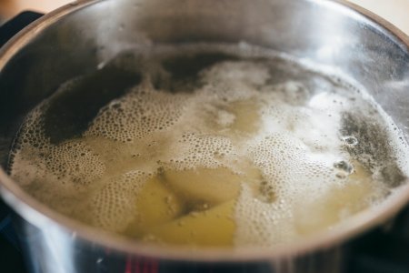 Картофель очистить, отварить. С отварного картофеля слить воду.