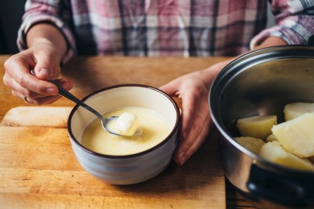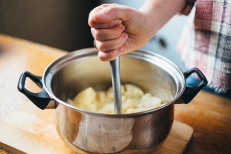 Размять картофель толкушкой. Долить молока и еще раз размять.