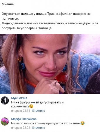 5 января 2018 года поклонники реалити-шоу заметили, насколько низко опустилась Елизавета Триандафилиди, позволившая себе заговорить на тему интимных взаимоотношений. Лиза уже не впервые буквально шокирует фанатов телепрограммы. Многие не скрывают своего возмущения ее абсолютной неразборчивостью в плане физической близости, к тому же сама молодая женщина явно не видит ничего особенного ни в том, что она позволяет себе сексуальные контакты со множеством представителей сильного пола, ни в том, что за всем происходящим посредством телеэкрана наблюдает и ее подрастающая дочка. Смотрите также: дом 2 8 января 2018 вечерний Приверженцев телестройки окончательно вывели из себя разговоры Елизаветы, касающиеся вкуса спермы Алексея Чайчица, тогда как сам молодой человек нисколько не скрывает того факта, что видит в Триандафилиди всего лишь «проектную историю» и вовсе не собирается строить с нею какие-либо длительные и серьезные отношения. Большинство поклонников телепередачи считают, что теперь Лиза, которой уже просто некуда опускаться далее, уже не сумеет восстановить собственную репутацию, и единственным решением всех имеющихся проблем для женщины может стать лишь ее уход за пределы периметра. Свое мнение о том, действительно ли Елизавета Триандафилиди сумела заслужить к себе лишь крайне негативное отношение со стороны телезрителей и коллег по телешоу и ей следует оставить программу, вы можете высказать в комментариях.