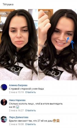 4 января 2018 года посетители социальных сетей сделали весьма неутешительный вывод о том, что лицо Виктории Романец уже безнадежно испорчено многочисленными и к тому же явно не слишком удачными процедурами косметического характера. Уже на протяжении нескольких недель фанаты пытаются понять, что же на самом деле происходит с лицом молодой женщины. Нет сомнений в том, что теперь оно выглядит буквально перекошенным. Наиболее неприятной и сложной проблемой окружающие считают то, что Виктория при этом успела явно окриветь на один глаз. Смотрите также: дом 2 7 января вечерний К тому же подписчики нисколько не удивляются тому, что внешний вид Вики неуклонно ухудшается с каждым днем. Они полагают, что регулярные уколы ботокса и прочие косметические манипуляции в итоге сыграли с Романец недобрую шутку, отомстив за ее чрезмерное пристрастие к трансформациям. При этом не лучшим образом проявляет себя уже и не столь юный возраст Виктории. Во всяком случае, почти никто не склонен в том, что бывшей участнице телешоу еще не исполнилось 30, на последних фотографиях она кажется женщиной, уже достаточно давно перешагнувшей 40-летний рубеж. Впечатление от снимка и мнение о том, действительно ли Виктория Романец слишком переусердствовала с услугами косметологов, что привело к весьма негативным последствиям, вы можете высказать в комментариях.