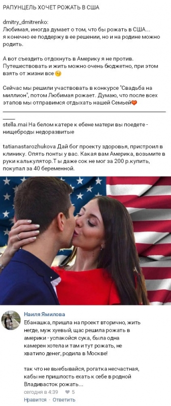 Но сейчас, когда Рапунцель и ее супруг Дмитрий Дмитренко сообщили всем о своих планах относительно предстоящих родов, поклонники телестройки не скрывают откровенного негодования. Оказалось, что эти двое намереваются ради этого важного события отправиться в Соединенные Штаты, чтобы не только обеспечить будущей маме и ребенку оптимальный уровень медицинского обслуживания, но и сделать ожидаемую дочь обладательницей американского гражданства.