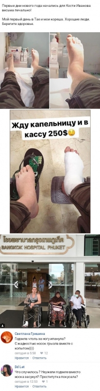 8 января 2018 года стало известно о том, что желанные для Константина Иванова каникулы в Таиланде оказались испорченными фактически сразу же после его приезда в эту страну. Почти никто не склонен был верить в то, что после весьма некрасивого выступления в телепрограмме Первого канала «На самом деле» Константин и Александра Гозиас смогут снова воссоединиться. Но выяснившаяся правда о многократных изменах нисколько не помешала этим двоим немедленно помириться. Но, пока молодая женщина находится вместе с членами своей семьи у себя на родине в Балтийске, Иванов предпочитает отдыхать в обществе приятелей на территории Таиланда. Смотрите также: дом2 11.01.2018 ночной эфир Правда, после происшедшего с Костей на отдыхе, Саше, оставившей возлюбленного без наблюдения, едва ли следует беспокоиться, в отличие от самого Иванова, каникулы которого однозначно не удались. Исходя из последней фотографии, продемонстрированной молодым мужчиной его подписчикам, с Константином случилась серьезная неприятность. В первый же день пребывания за границей парень сломал лодыжку, теперь ему приходится перемещаться в коляске. Для Иванова является достаточно неприятным и то обстоятельство, что лечение в здешнем госпитале обошлось ему в 250 долларов. К тому же в результате создавшегося положения речь идет о немедленном возвращении молодого человека в Москву. Свое мнение о том, сочувствуете ли вы Константину Иванову, оказавшемуся в столь неблагоприятной ситуации, вы можете изложить в комментариях.