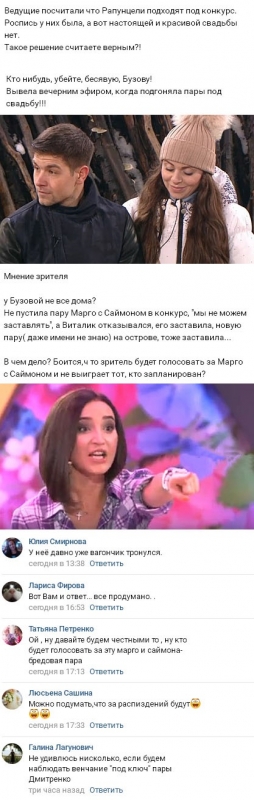 Для большинства приверженцев телепрограммы последней каплей оказалось решение Бузовой допустить семью Дмитрия Дмитренко и Ольги Рапунцель к участию в проектном конкурсе «Свадьба на миллион». Ведь эти двое не только уже состоят в официальном браке, но и совсем недавно находились на грани полного краха их супружества. К тому же выполнять многие задания конкурса Ольге, пребывающей в «интересном положении», будет чрезвычайно трудно, соответственно, за нее необходимые действия станет осуществлять муж, что также окажется явным нарушением конкурсных правил.