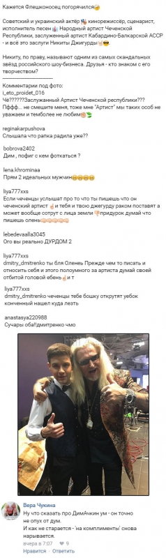 Под фотоснимком с популярным шоуменом Дмитренко по неосторожности подписал, что Никита является заслуженным артистом Чеченской республики, и эти слова полностью вывели из терпения многих фанатов телешоу, которых уже давно раздражают весьма неумные изречения обитателя периметра.