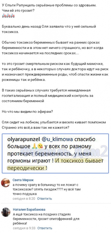 Свое мнение о том, по каким причинам Ольга Рапунцель не принимает необходимых мер в связи с неважным самочувствием, вы можете изложить в комментариях.