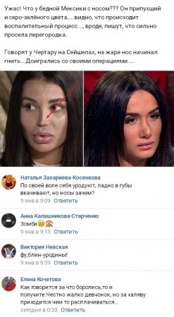 Но теперь, когда оказалось, что у девушки имеются определенные проблемы со здоровьем, все полностью встало на свои места. Фанатам стало известно о том, что у Четрару, как и у Марины Мексики, которой пришлось повторить ринопластическую операцию, значительно просела носовая перегородка. А наиболее неприятным и тревожным является тот факт, что во время пребывания на жаре на Сейшелах нос Лилии начал просто гнить.