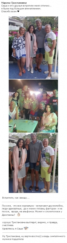 Совсем недавно ушедшая из периметра Марина Тристановна уже разместила в Интернете снимки в обществе ее друга Александра и его приятелей, которые, по ее словам, оказались весьма приветливыми и гостеприимными. К тому же нет сомнений в том, что мама Таты впервые за длительный период времени не только чувствует себя счастливой, но и по-настоящему влюблена в представителя противоположного пола. Поклонники отметили и тот факт, что Марина Тристановна теперь выглядит значительно лучше и привлекательнее, чем всего несколькими неделями ранее.
