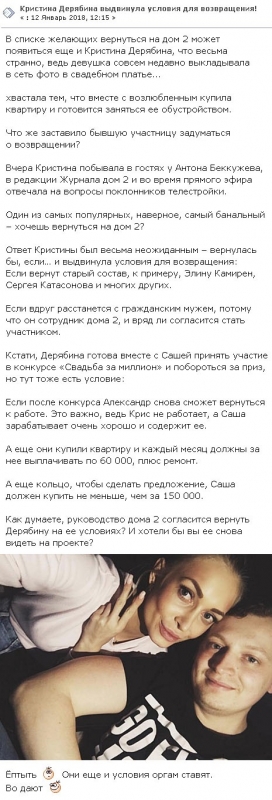 18 января 2018 года стало известно о том, что Кристина Дерябина дала согласие вернуться на телестройку, правда, девушка при этом выдвинула организаторам проекта определенные материальные требования. Если новый приход в периметр Дмитрия Дмитренко почти никого не удивил, то многие фанаты искренне изумились, узнав о планах Александра Гобозова снова оказаться в числе участников реалити-шоу. Поклонники телепрограммы также находятся в недоумении из-за желания вернуться, высказанного Константином Ивановым, Кристиной Дерябиной и Александрой Гозиас. Ведь эти трое ранее оставили телепередачу по собственной воле и, если судить по фотографиям, публикуемым ими в социальных сетях, они чувствуют себя вполне комфортно за пределами периметра, даже не являясь при этом одинокими. Смотрите также: дом 2 вечерний выпуск от 21/01/2018 При этом Кристина, невзирая на ее взаимоотношения с сотрудником телешоу, не только абсолютно не против опять стать участницей телепроекта, но даже уже и назвала четкие условия своего возвращения. Дерябина готова испытать себя в конкурсе «Свадьба на миллион», но только в том случае, если по завершении состязания ее друг Александр снова сможет без проблем исполнять свои должностные обязанности. К тому же для молодой женщины имеет немалое значение и вознаграждение, которое ей могут предложить на телестройке. Исходя из расчетов Кристины, на двоих им требуется в месяц никак не менее 200 тысяч рублей, ведь только выплата ипотечного кредита за недавно приобретенное жилье равна 60 тысячам рублей ежемесячно, не считая неминуемых расходов на ремонт. Дерябина также рассматривает возможность и повторного участия в телепрограмме в поисках нового возлюбленного, если между нею и ее теперешним бойфрендом по каким-либо причинам произойдет разрыв. Свое мнение о том, желаете ли вы снова увидеть Кристину Дерябину среди обитателей периметра, вы можете изложить в комментариях.